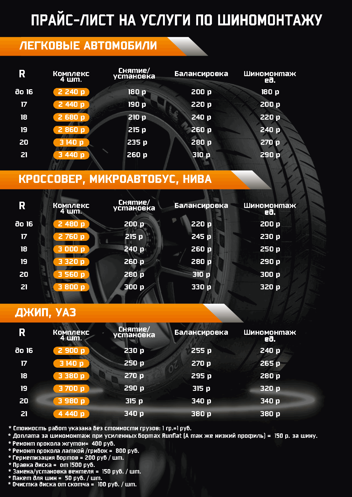 Услуги по шиномонтажу для легковых автомобилей и мотоциклов.